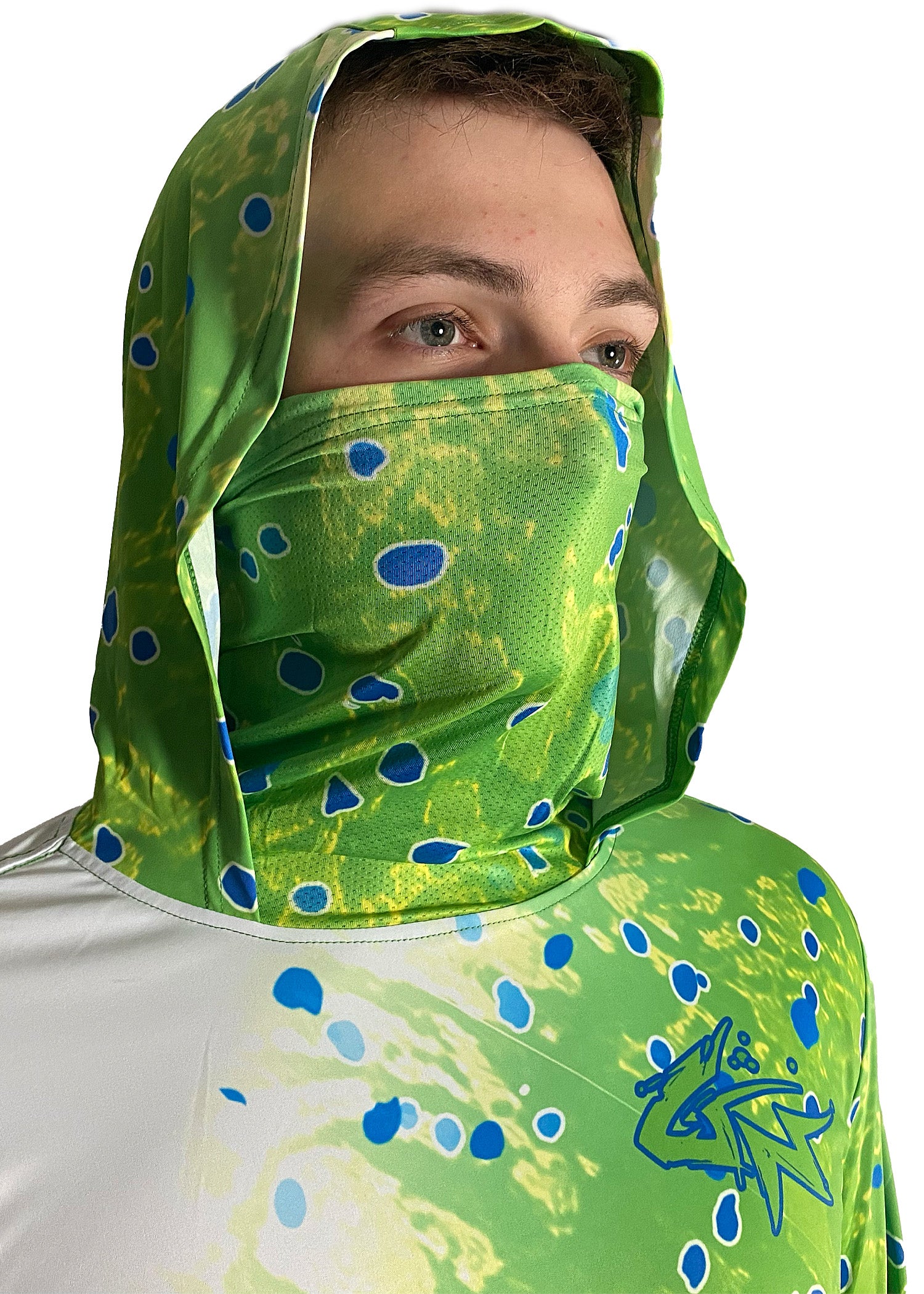 Catch your next big one with this hooded fishing shirt! Designed for the ultimate comfort and protection, featuring UPF 50+, and built in hoodie and mesh face shield for the ultimate protection, 4-way stretch for easy movement, and mesh side panels to keep you cool. Reel in the compliments with this shirt!